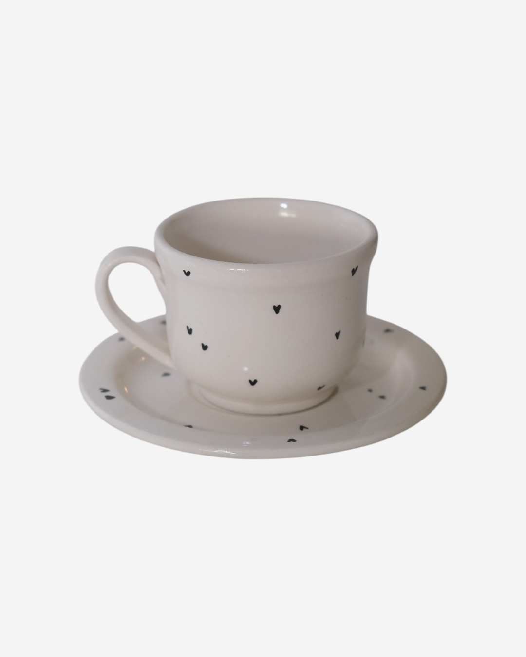 Add a touch of warmth and whimsy to your daily routine with this beautifully handcrafted ceramic mug and matching saucer. Designed with minimalist elegance, this creamy white set features delicate black heart patterns scattered across its smooth surface, offering a playful yet refined aesthetic. Perfect for sipping your favorite tea, coffee, or espresso, the mug is both microwave and dishwasher safe, combining practicality with style. Whether you’re enjoying a quiet morning or hosting guests, this set brings charm and coziness to any table setting.