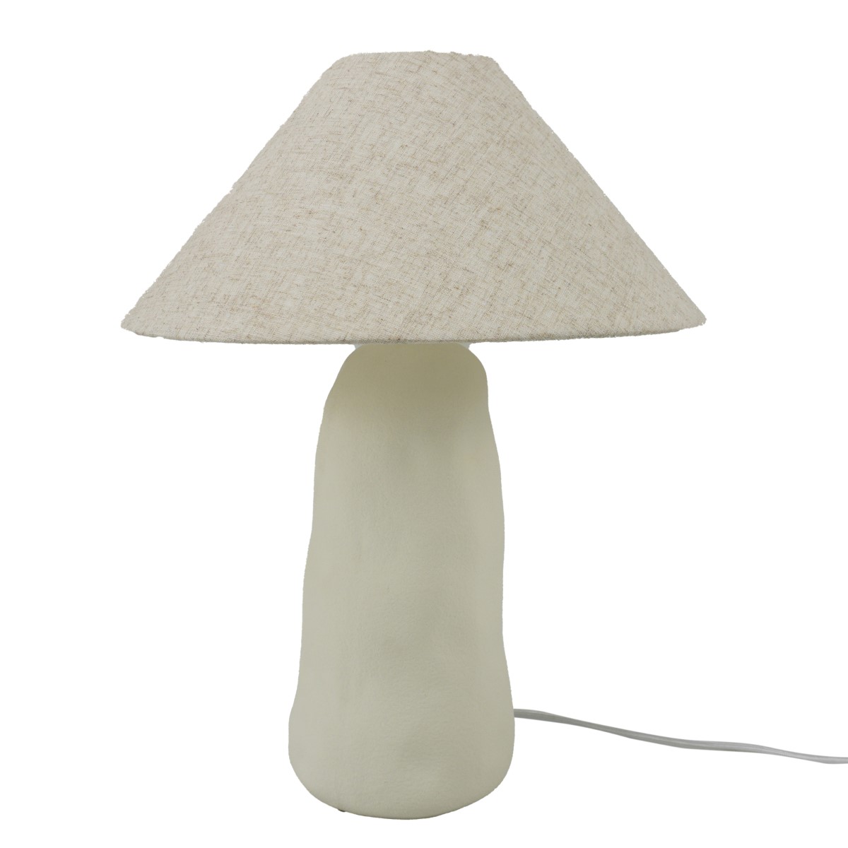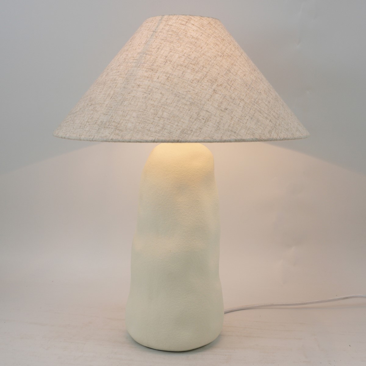 This elegant table lamp features a handcrafted porcelain base with an organic, sculptural form that adds a soft, artistic touch to any space.