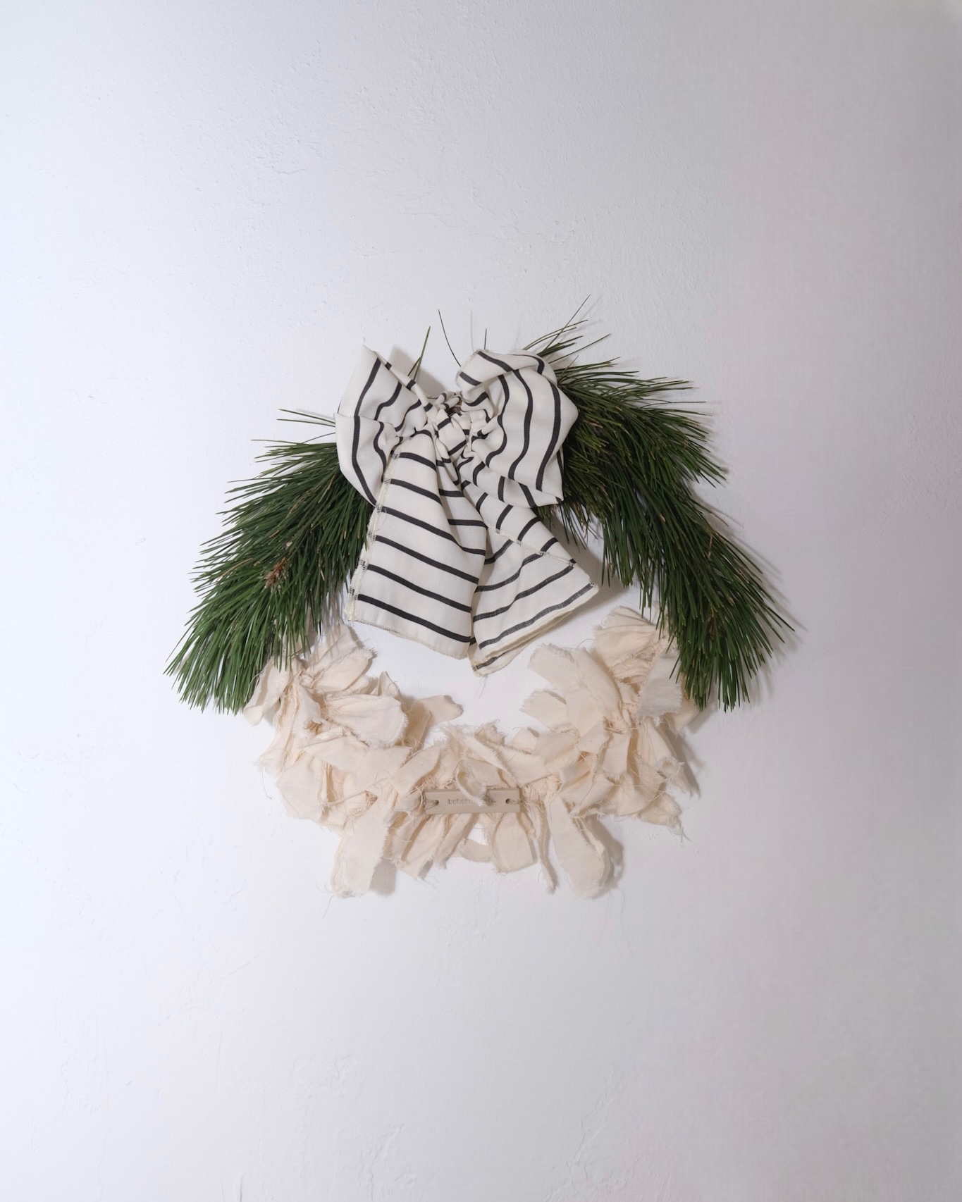 Bring a touch of natural elegance to your home with this beautifully handcrafted wreath. Designed with simple, organic charm, it features fresh green pine branches arranged in a soft, graceful arc. The bottom half is adorned with hand-torn, cream-colored canvas fabric strips that create a full, textured, and cozy look. At the top, a large black-and-white striped bow adds a modern farmhouse accent, perfectly balancing rustic warmth with clean, minimal style.