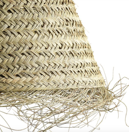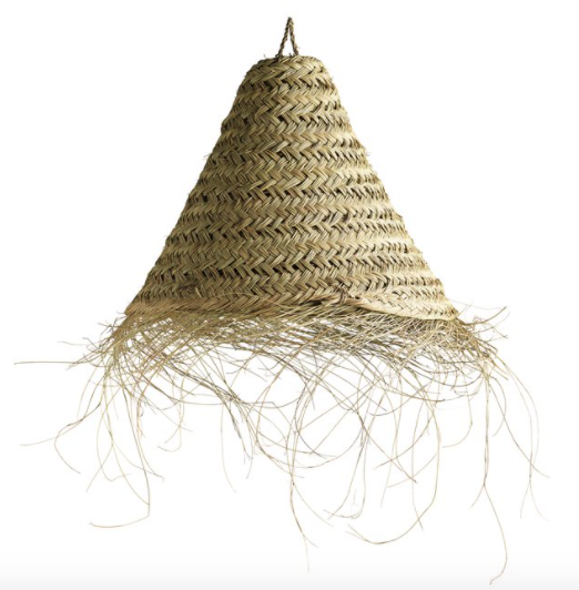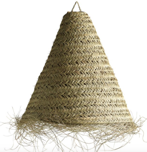 Cone shaped lamp shade is made of leaves from the date palm. The leaves are weaved in a wide pattern that in the bottom ends as lovely loose frills that adds a light and fun look. The shade is made with a hook on top that makes it easy to hang. Socket and wire is not included.