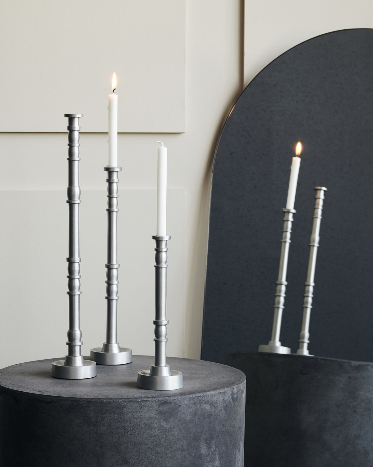 Tall candlestick in an elegant and minimalist design. The details and colour give off a certain classic vibe while the aluminium material makes it contemporary. Jersey, as the candlestick is called, comes in 3 sizes and this is the tallest version. Combine all heights to create a cosy and impressive display on the dining table. Adding candles will only make more of an impact. Your furniture stays protected as Jersey comes with a felt pad at the bottom. For candles with a diameter of 1.2 cm.