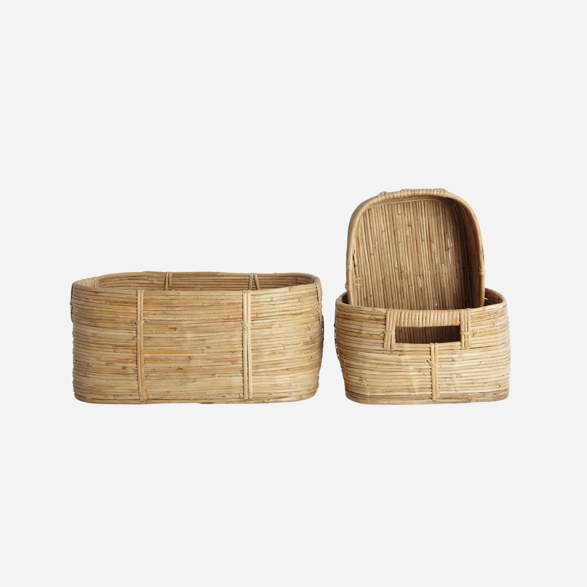 Decorate your home with natural materials to create a personal and warm atmosphere in your home. Chaka is a stunning basket, it’s available in three different sizes and it’s made of 99% rattan and 1% bamboo. The perfect element for a simple Nordic-inspired style. These baskets are designed for storage. They are also simultaneously perfect as a nice and warm contrast to the Nordic environment. They are a decorative detail. Use these baskets for storing items in the kitchen, living room or bathroom. The baskets have handles, which make them easy to move around. Keep in a dry environment.