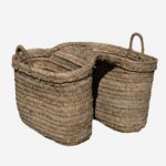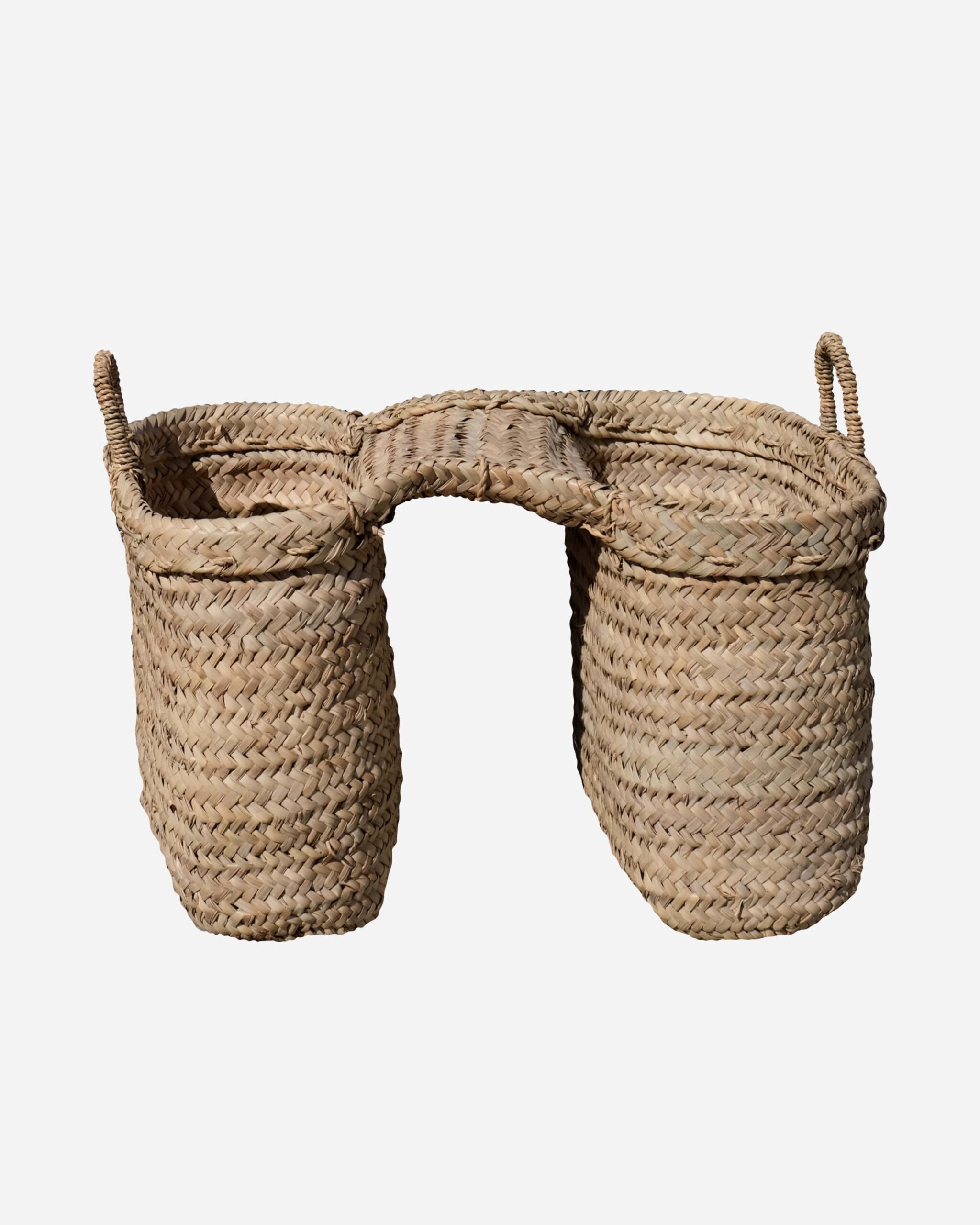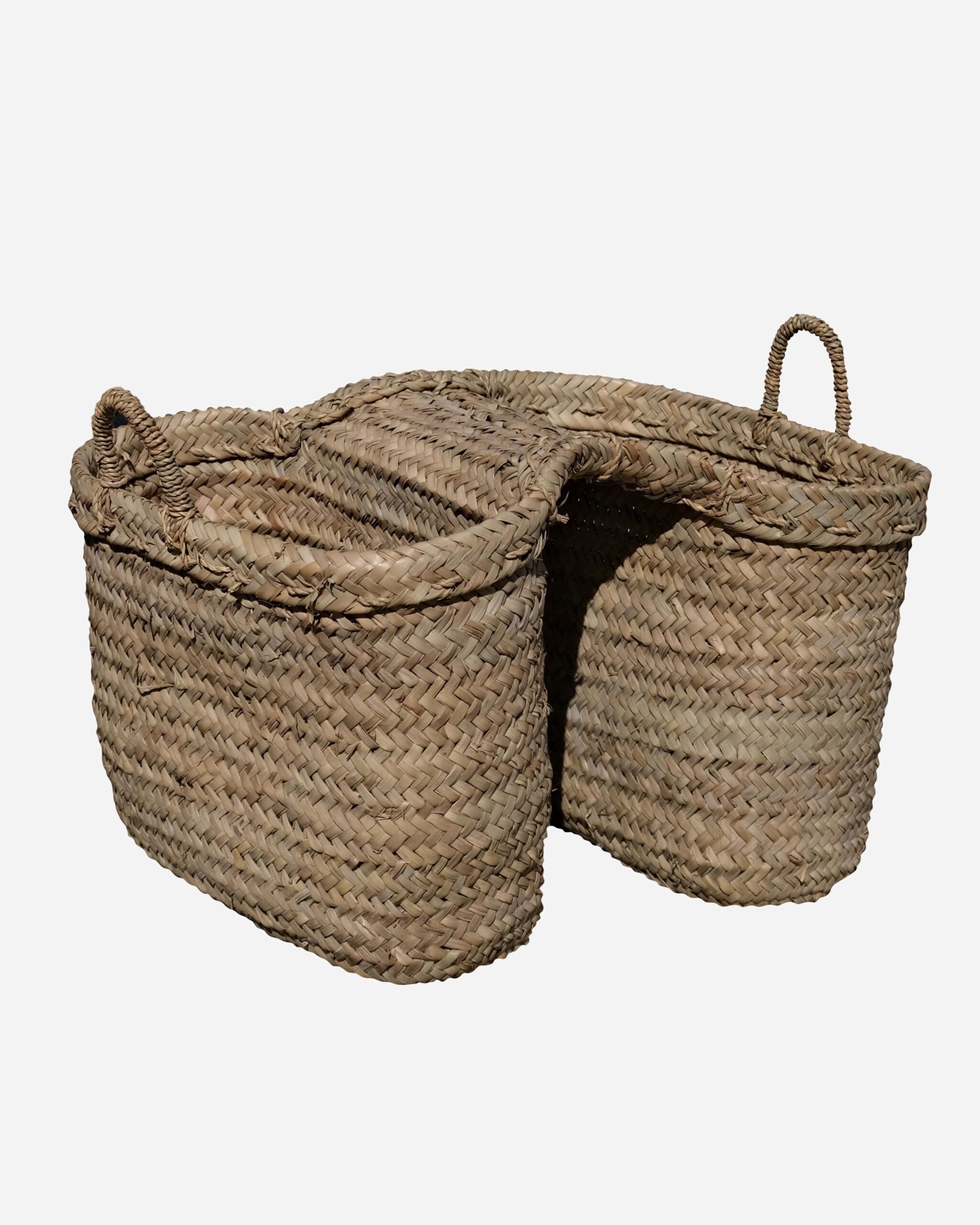 A double handmade basket for storage. A unique piece that can be place over a sofa arm, over a fence or on the floor. Its size its perfect for storage magazines, blankets or fruits.