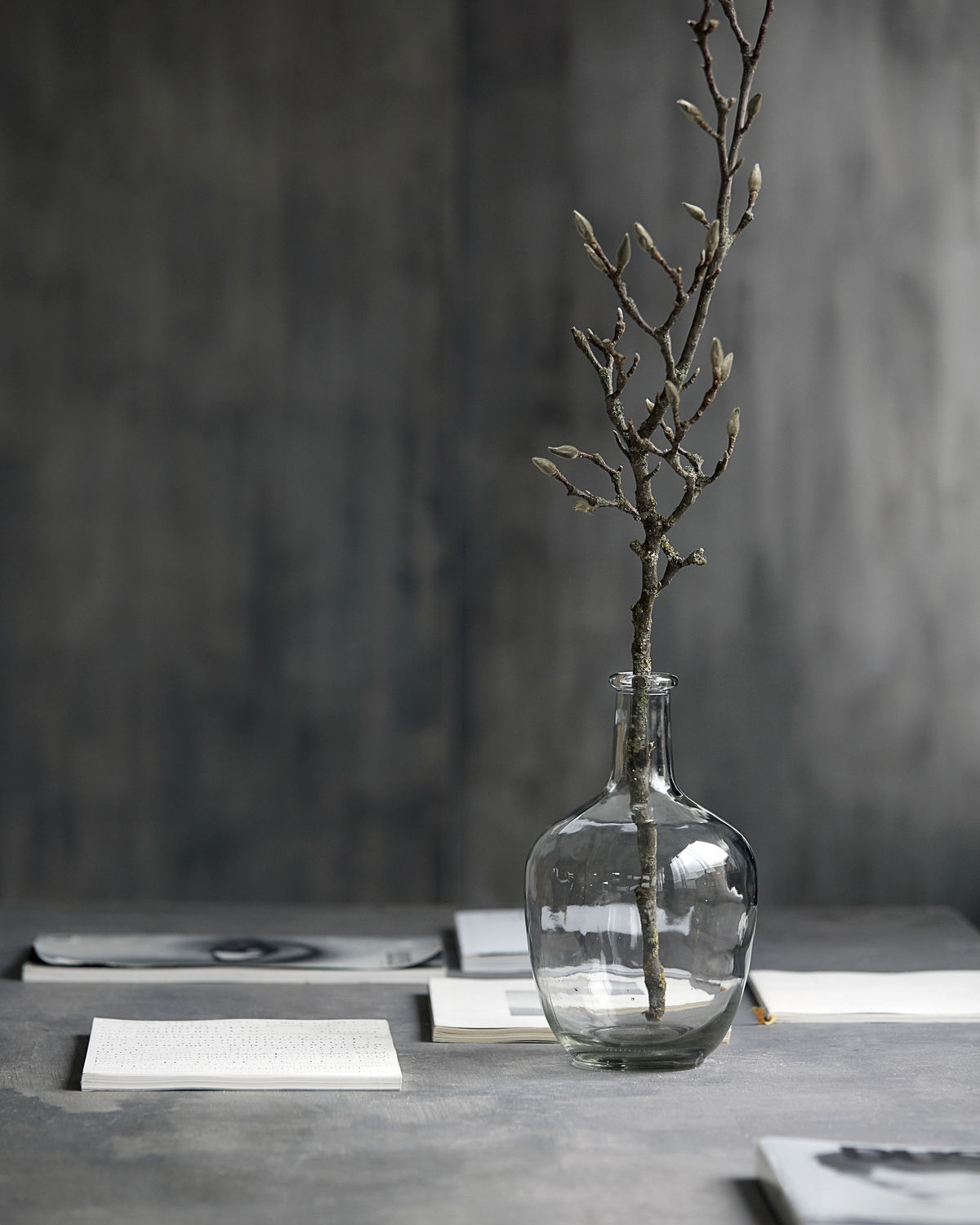 Glass is an elegant vase with a nice, organic shape. The vase has a narrow neck and a round bottom. It is therefore extremely suitable for a twig from your garden. Use the vase to create a calm, natural environment in your home. Pour some water into the bottom of the vase and decorate it with a single twig. The combination of simple materials will create a wonderful look with some spring notes.